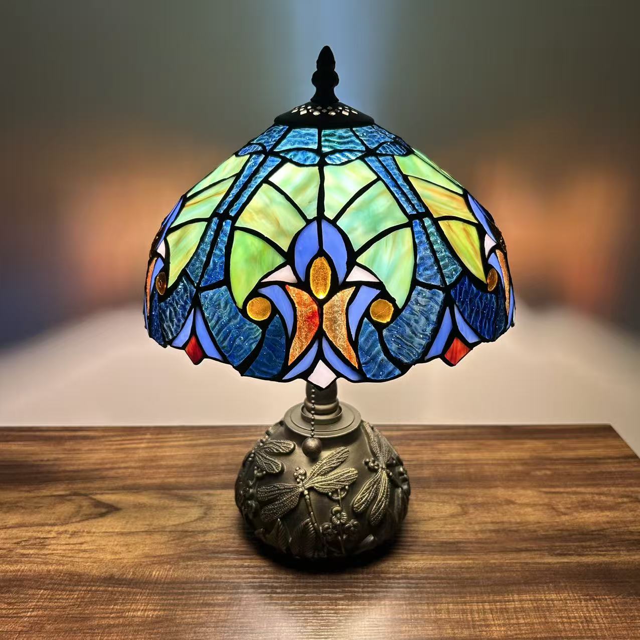 10"W*10"D*14"H. Stained glass lamp shade Resin base with bronze finish. Pull Chain Switch. LED bulb included. UL listed. Each piece of glass is hand-soldered into place using the traditional copper foil technique. 30 days free return and refund guarantee!. Shipped with UPS or FedEx. **Free Shipping and Return apply only to orders shipping to the 48 continental United States**