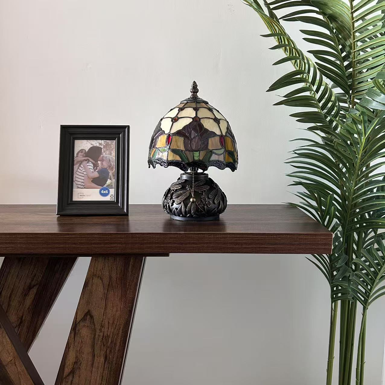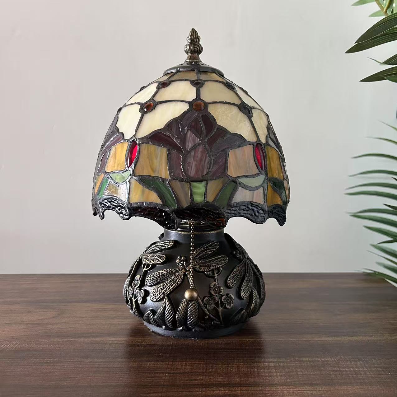 8"W*8"D*12"H. Stained glass lamp shade. Resin base with bronze finish. Pull Chain Switch. LED bulb included. UL listed. Each piece of stained glass is hand-soldered into place using the traditional copper foil technique...30 days free return and refund guarantee!. Shipped with UPS or FedEx. **Free Shipping and Return apply only to orders shipping to the 48 continental United States**