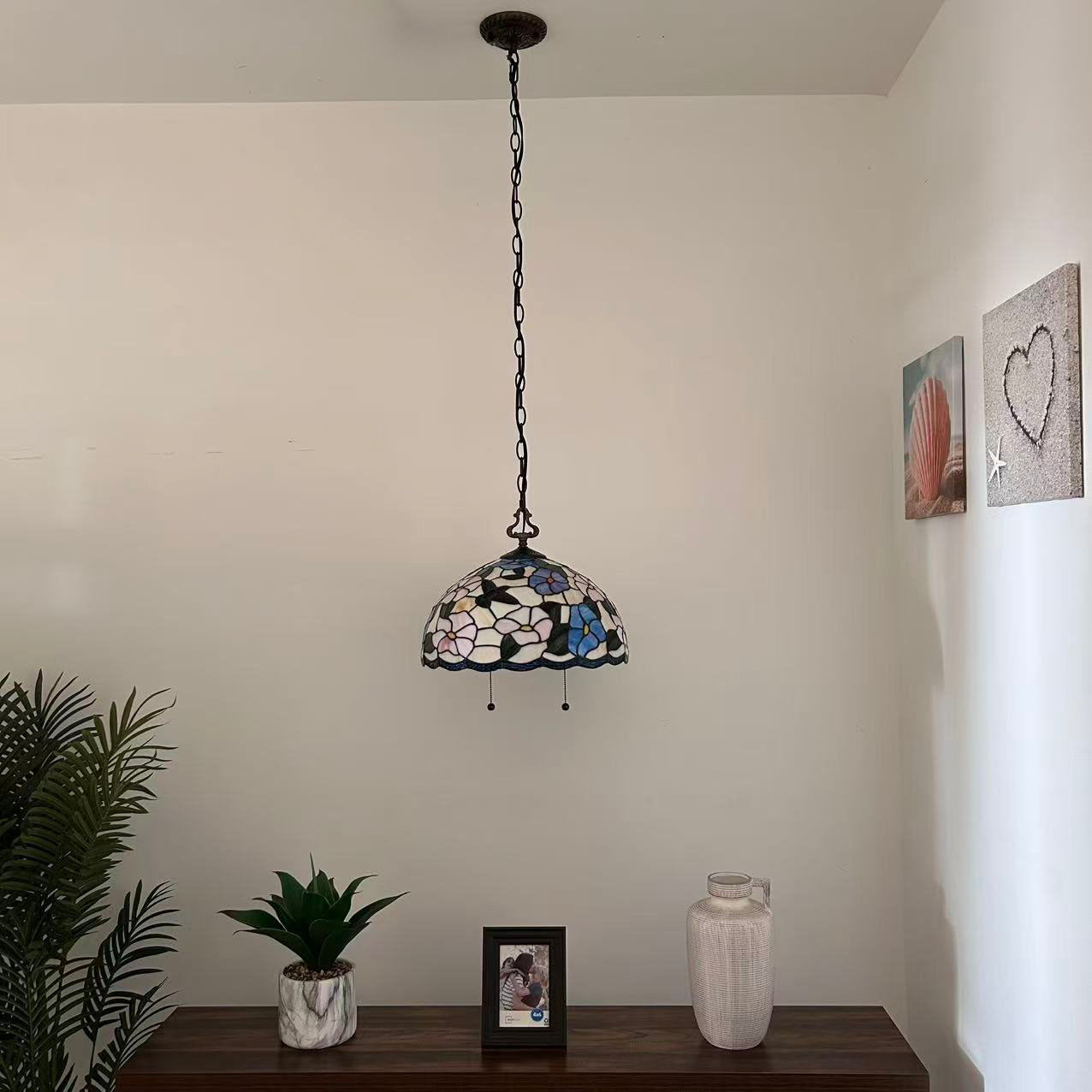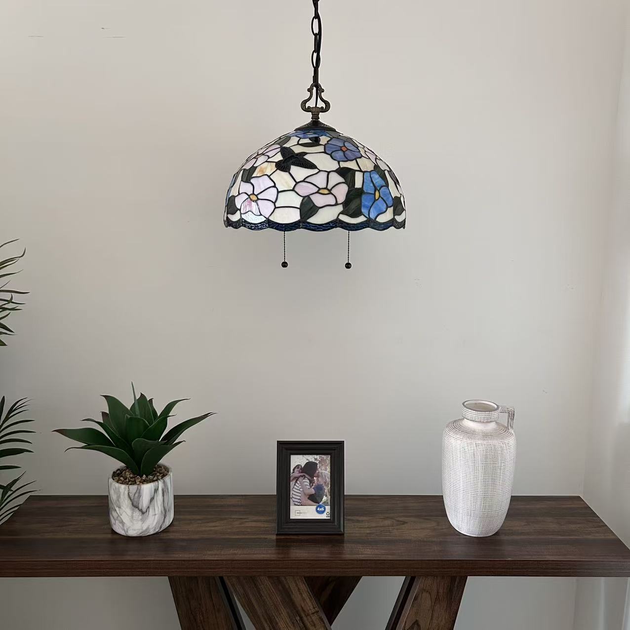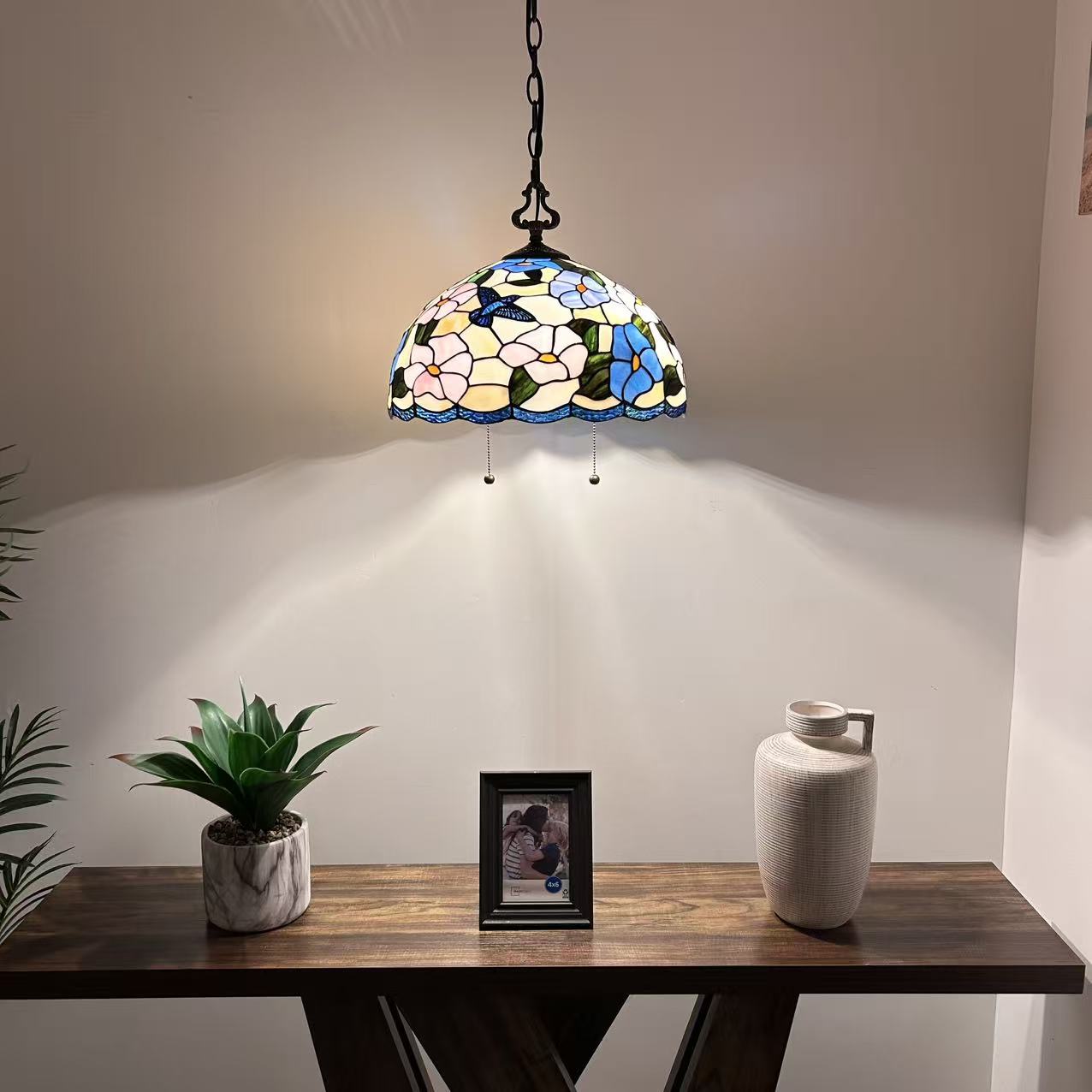 Tiffany Style Pendant Lighting Stained Glass Hummingbird Flowers LED Bulbs Included 16”W*16”D*75”H