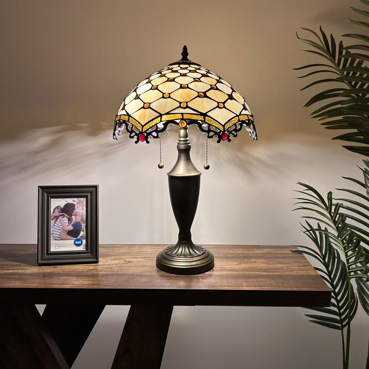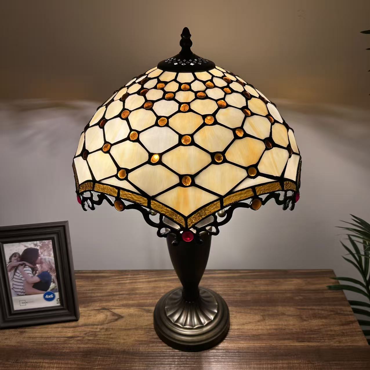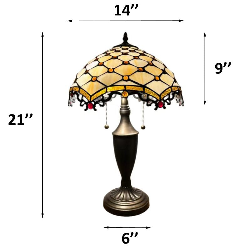 Tiffany Style Table Lamp Beige Stained Glass Crystal Beans 14"W*14"D*21"H