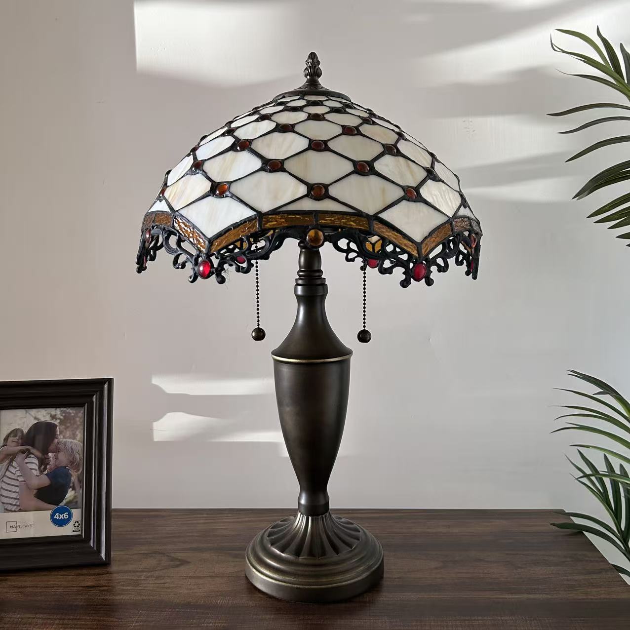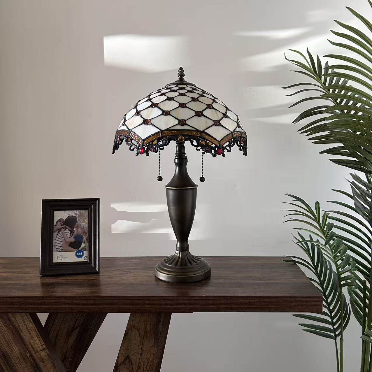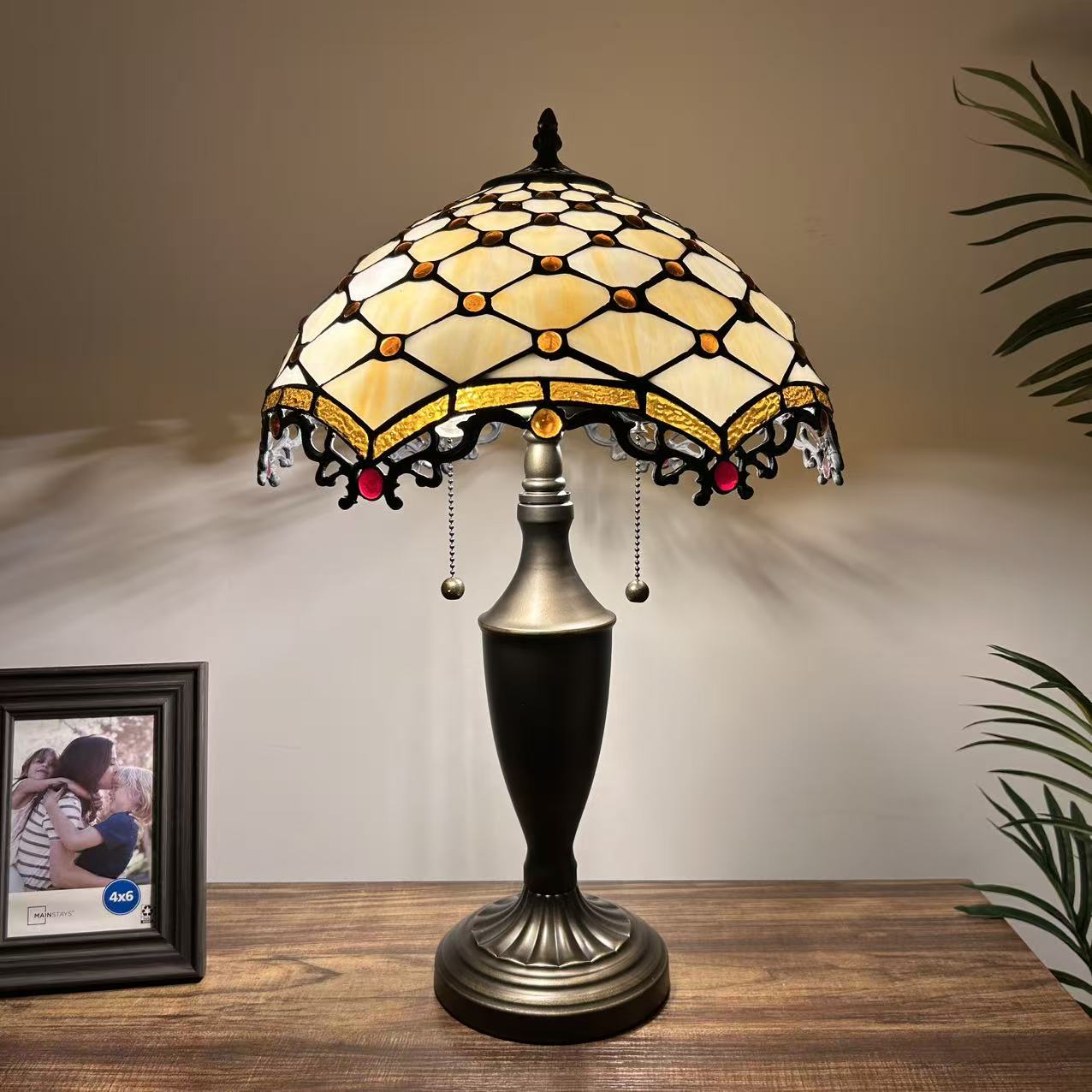 Tiffany Style Table Lamp Beige Stained Glass Crystal Beans 14"W*14"D*21"H