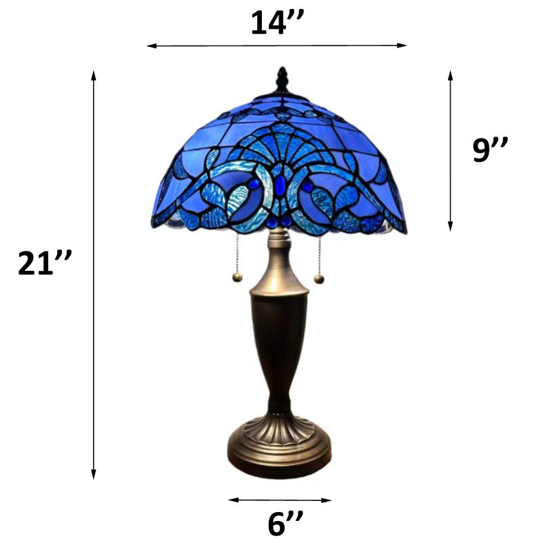 14"W*14"D*21"H. Stained glass lamp shade. Metal base with bronze finish. Pull Chain Switch. LED Bulbs Included. UL listed. Each piece of stained glass is hand-soldered into place using the traditional copper foil technique.  30 days free return and refund guarantee!. **Free Shipping and Return apply only to orders shipping to the 48 continental United States**