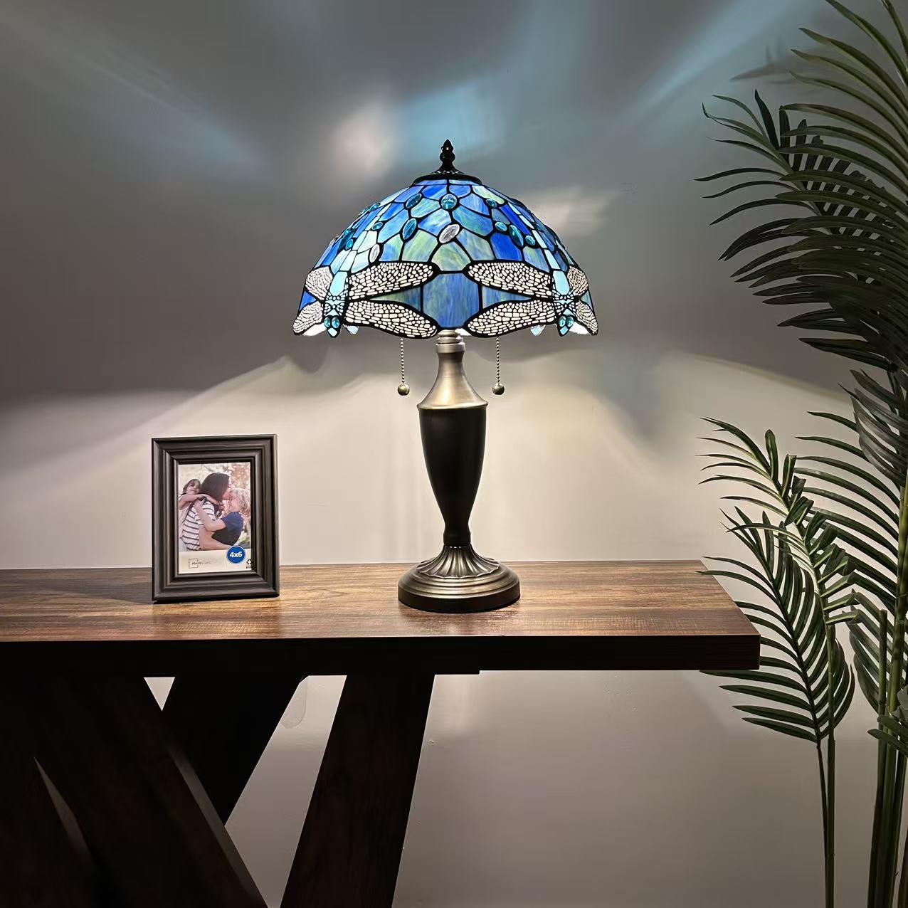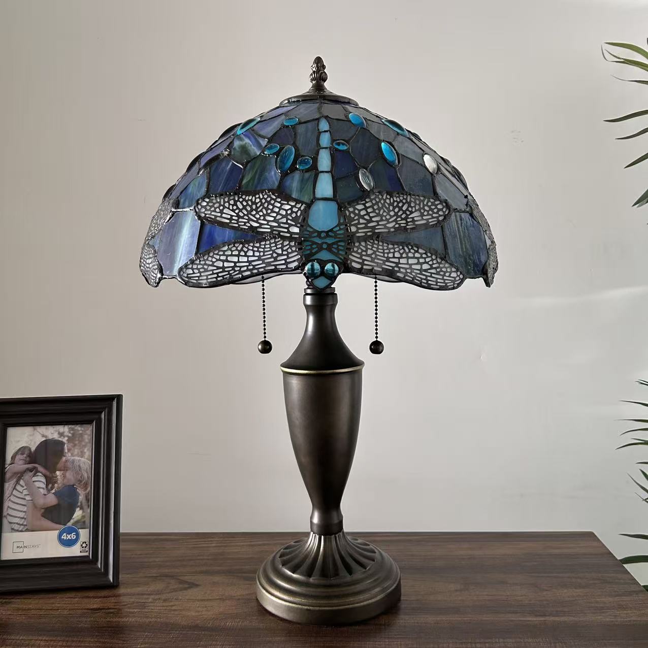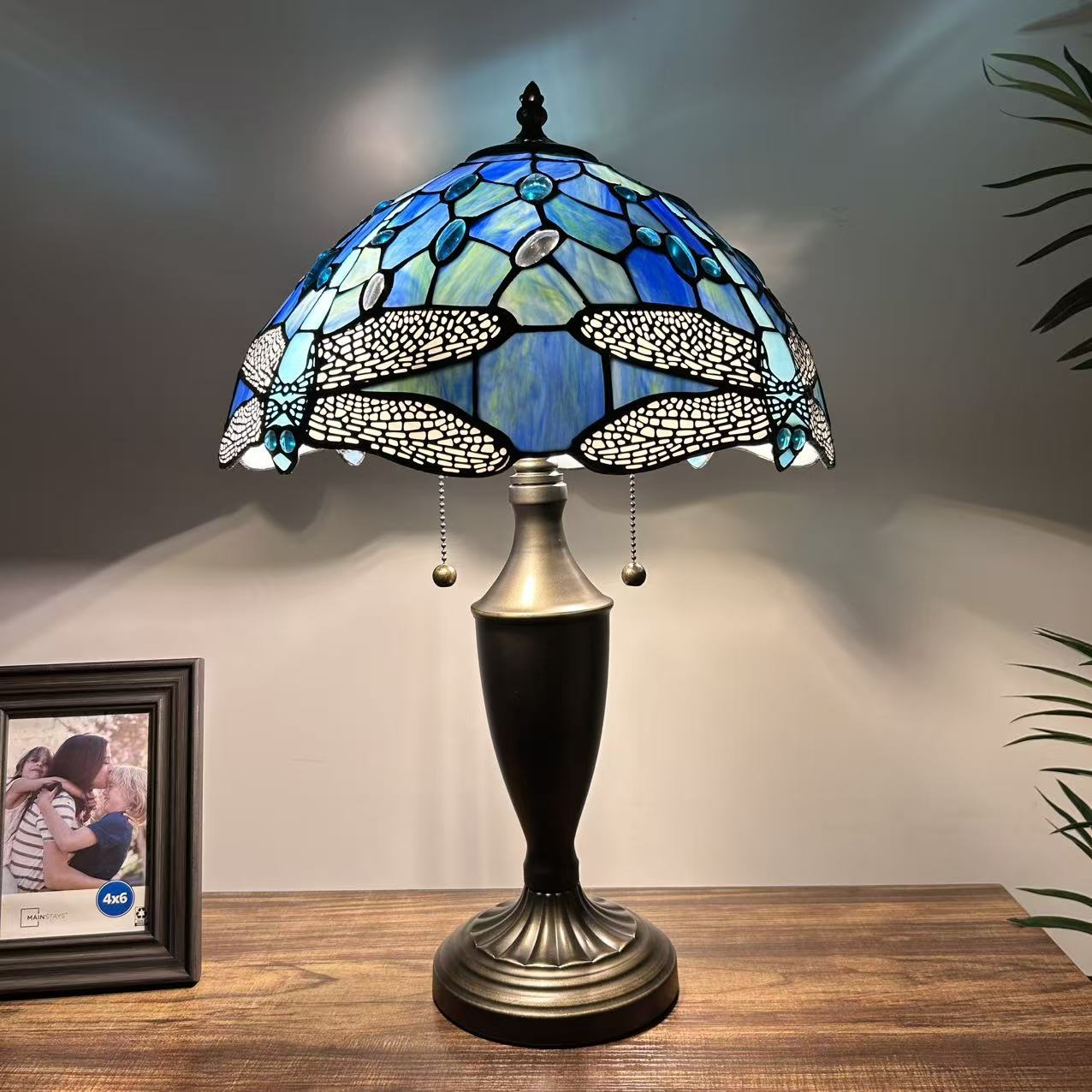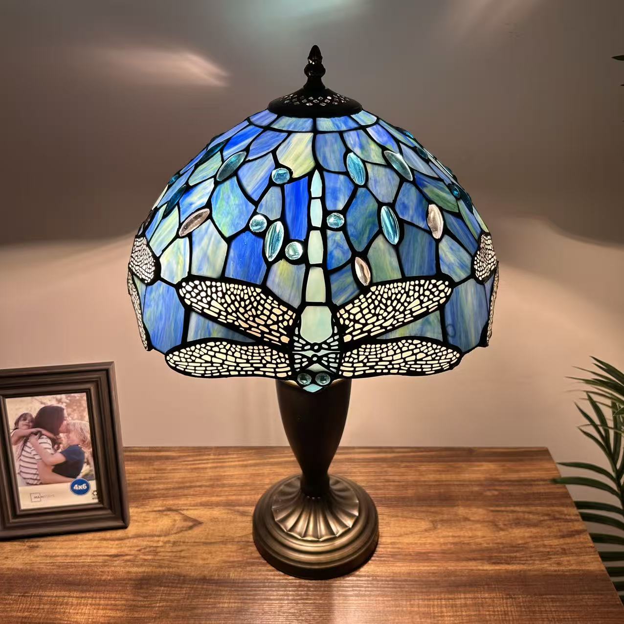 Tiffany Style Table Lamp Blue Stained Glass Dragonfly 14"W*14"D*21"H
