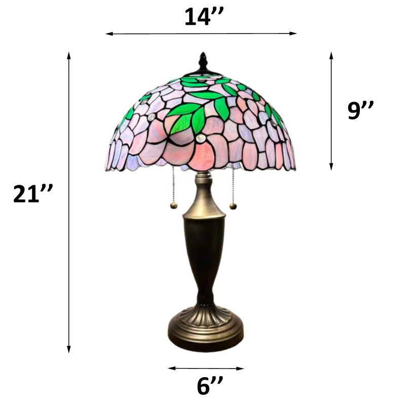 14"W*14"D*21"H. Stained glass lamp shade. Metal base with bronze finish. Pull Chain Switch. LED Bulbs Included. UL listed. Each piece of stained glass is hand-soldered into place using the traditional copper foil technique.  30 days free return and refund guarantee!. **Free Shipping and Return apply only to orders shipping to the 48 continental United States**