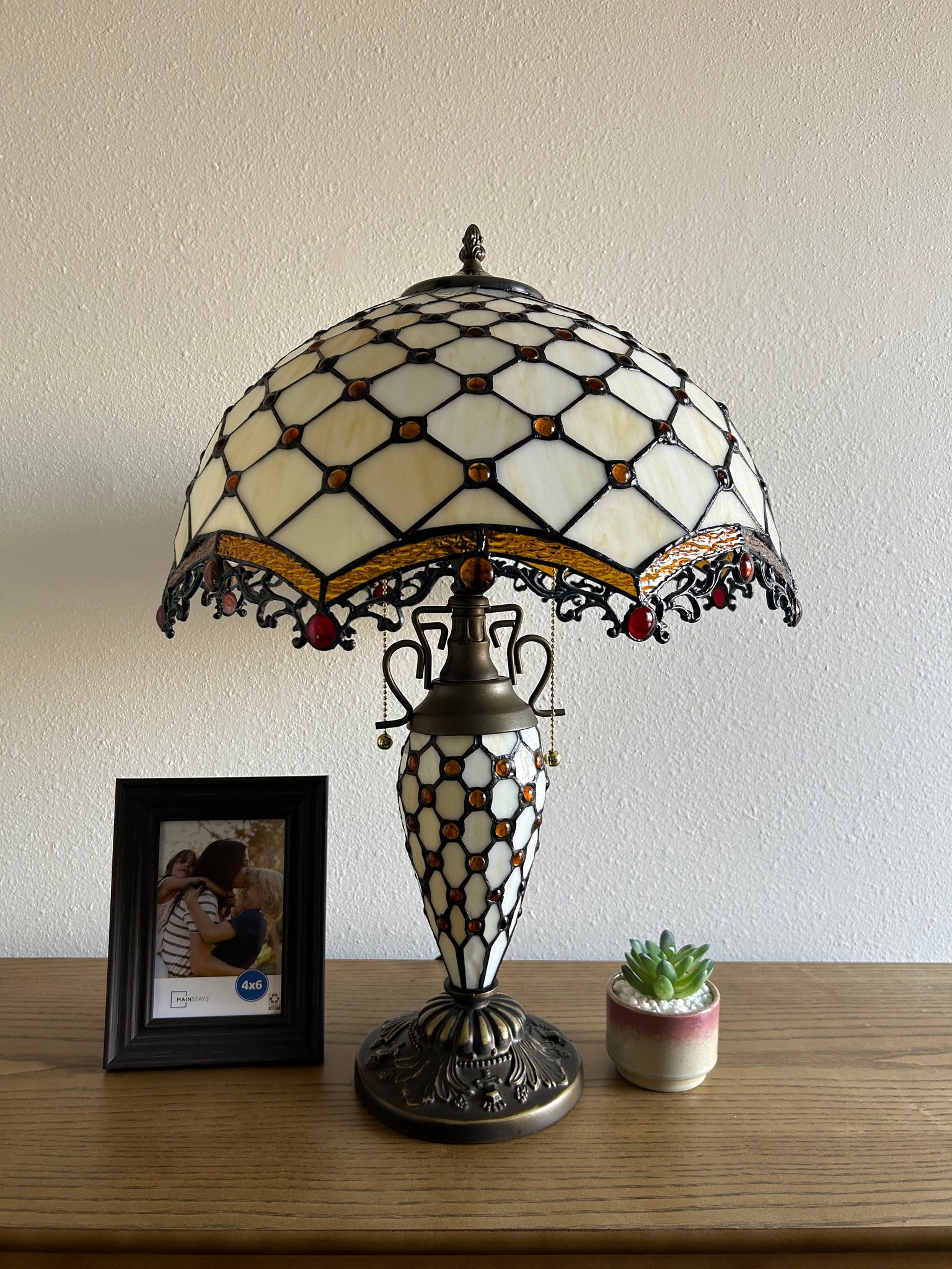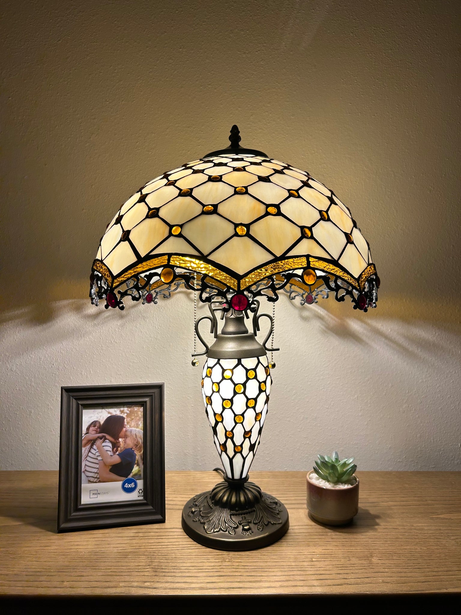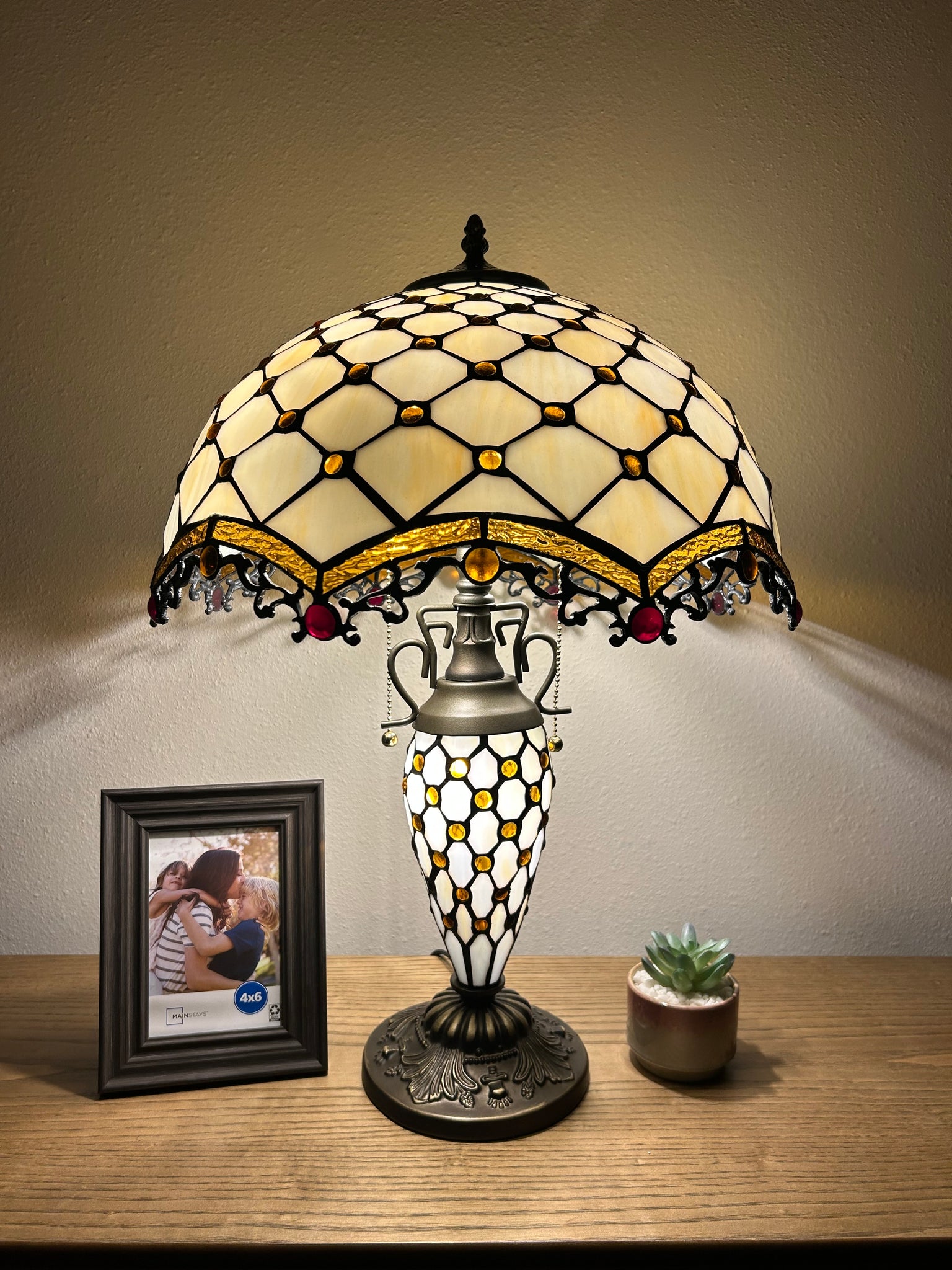 Tiffany Style Table Lamp Beige Stained Glass Mother-Daughter Vase Included LED Bulbs Vintage for Living Room Dining Room Bedroom Bedside Office Hotel H24*W16 in…