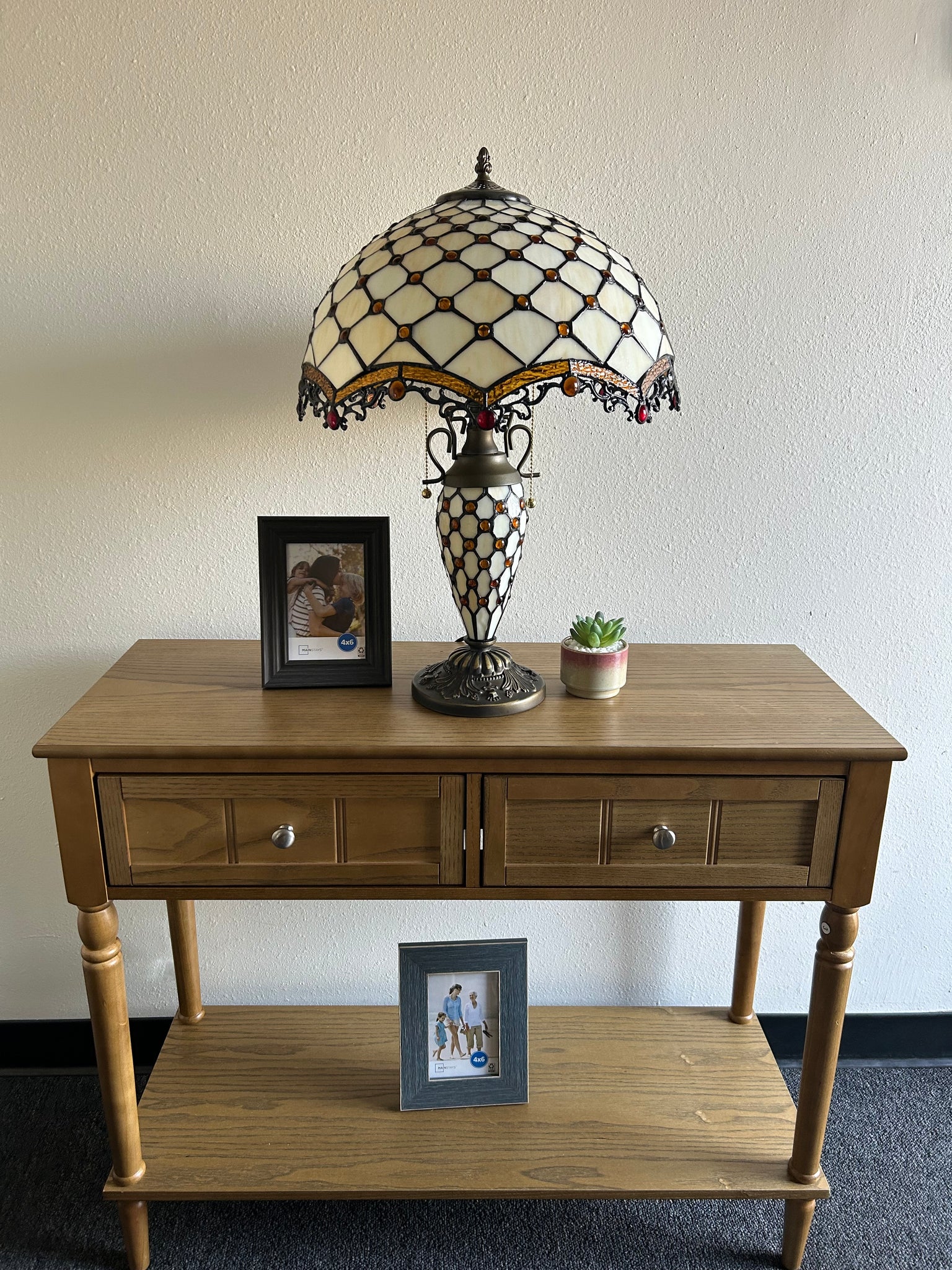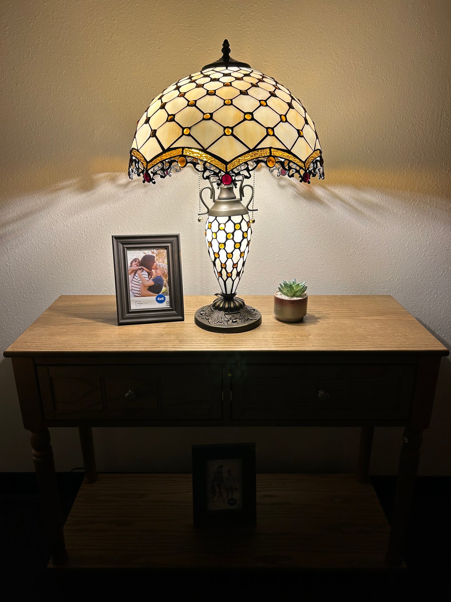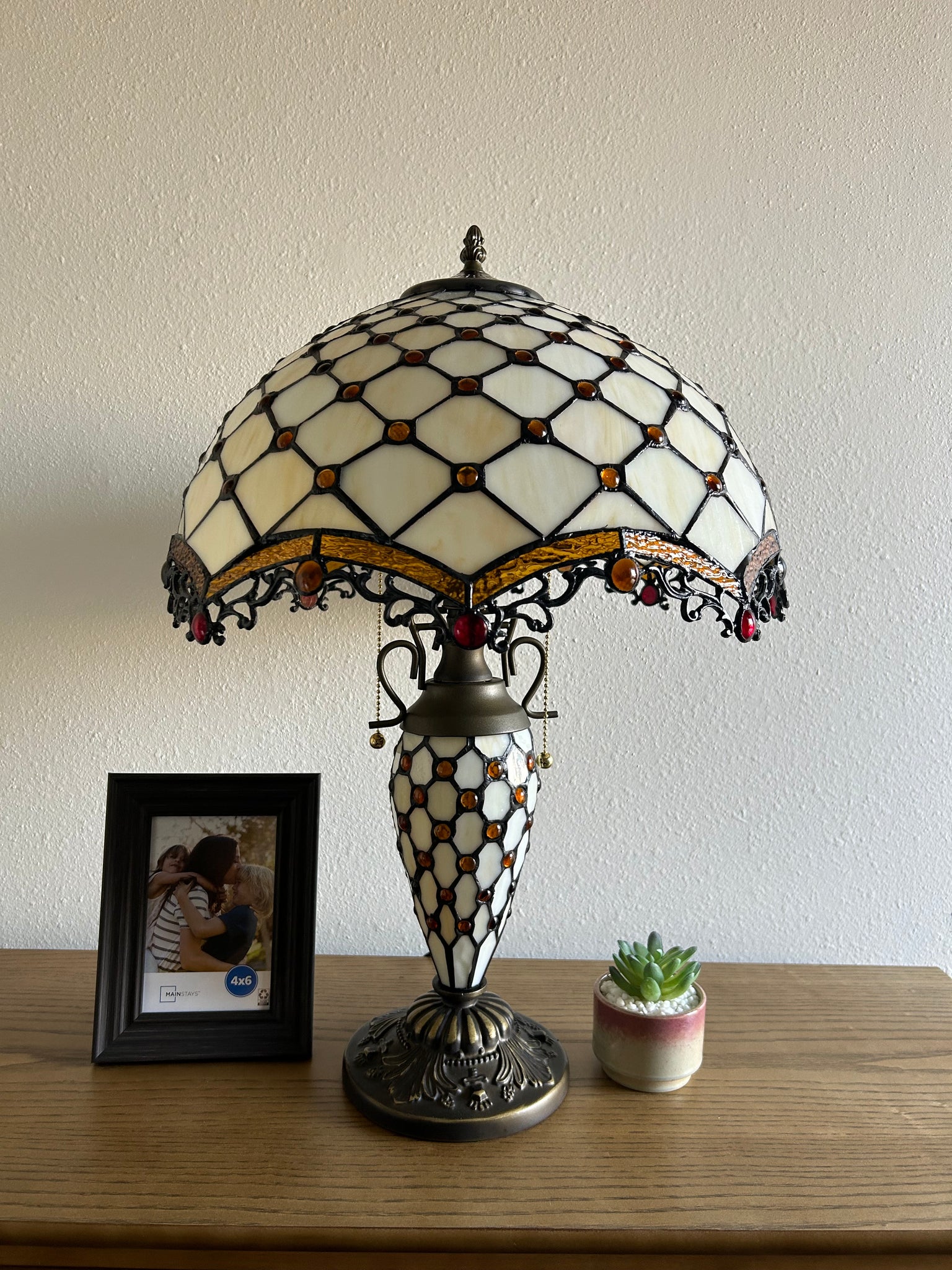 Tiffany Style Table Lamp Beige Stained Glass Mother-Daughter Vase Included LED Bulbs Vintage for Living Room Dining Room Bedroom Bedside Office Hotel H24*W16 in…