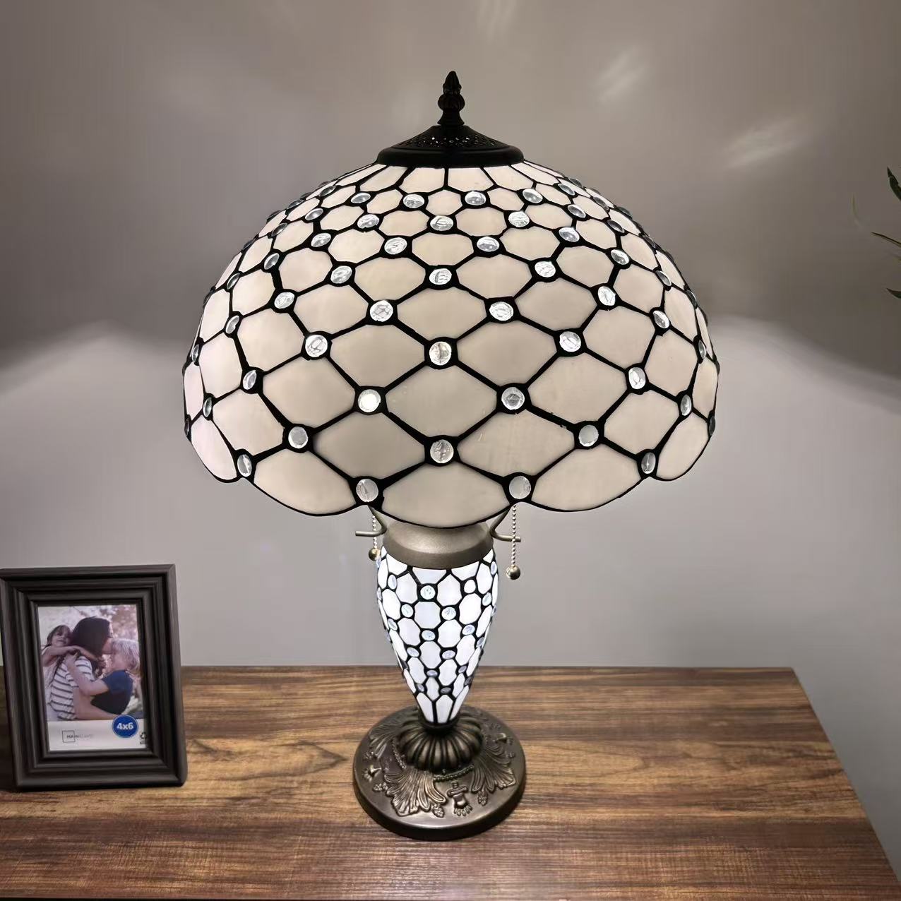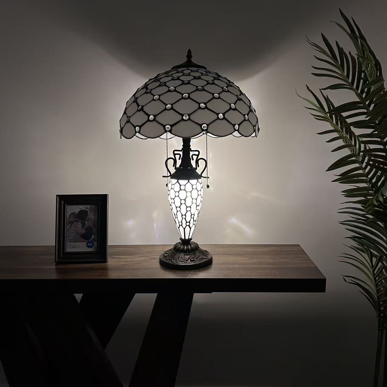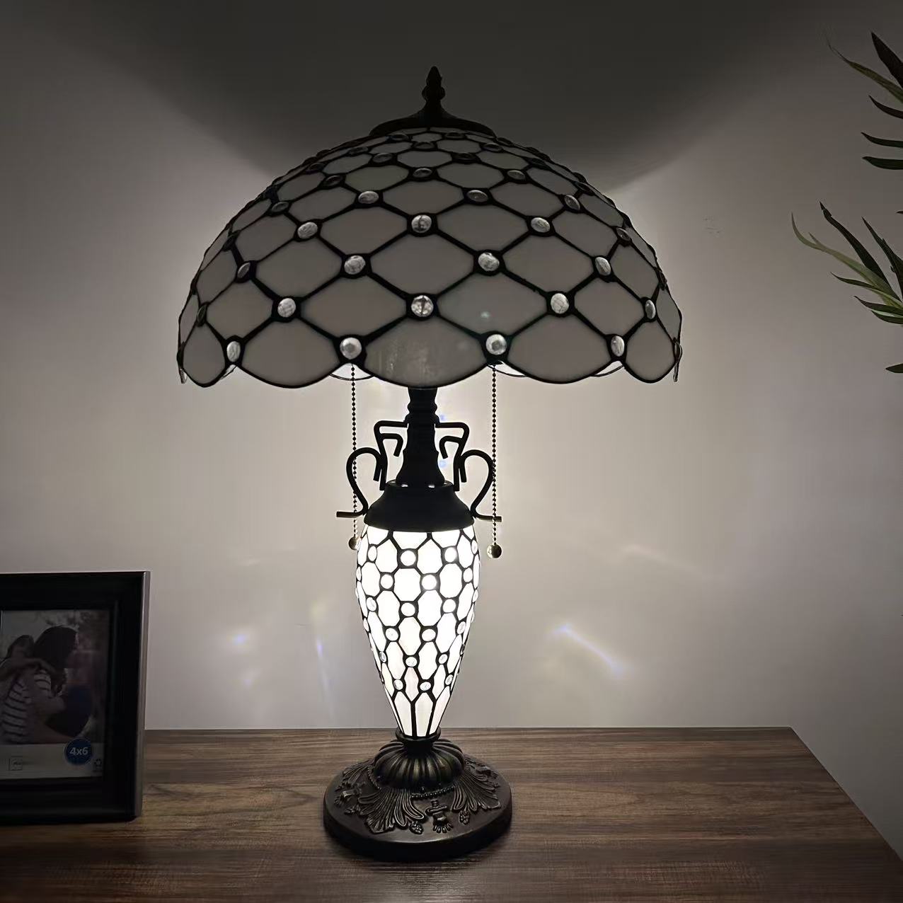 Tiffany Style Table Lamp White Stained Glass Crystal Beans Included LED Bulbs 24"H*16"W*16"D