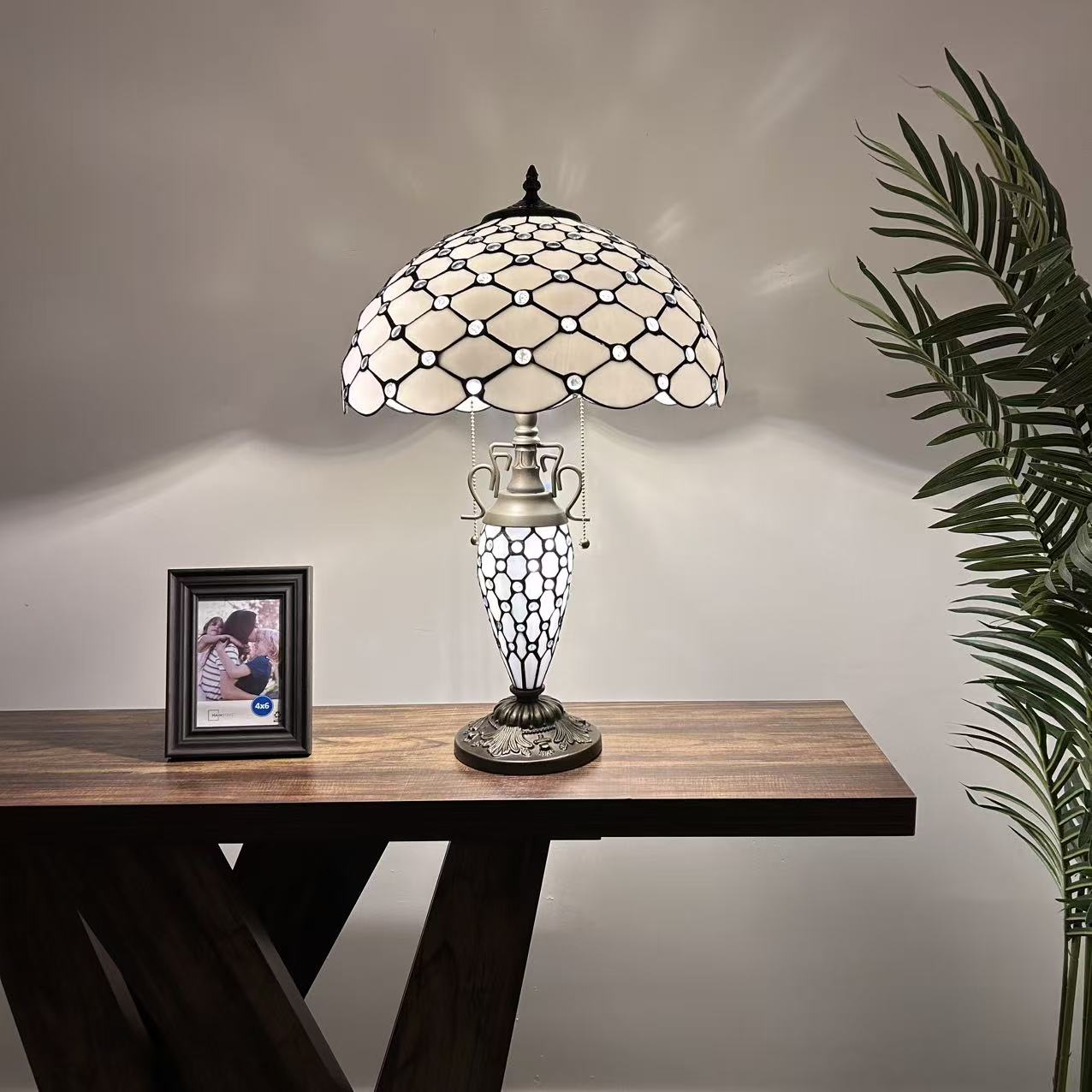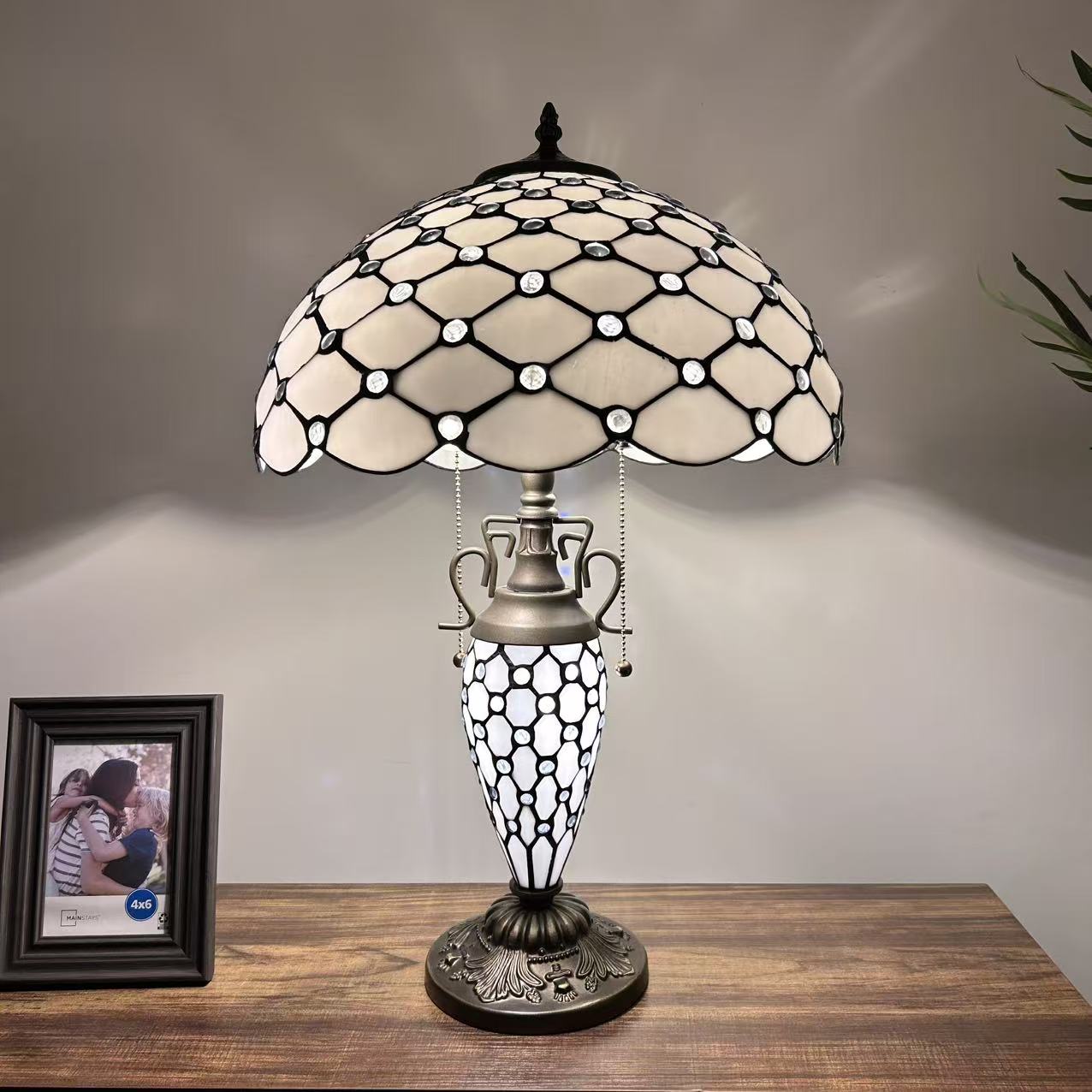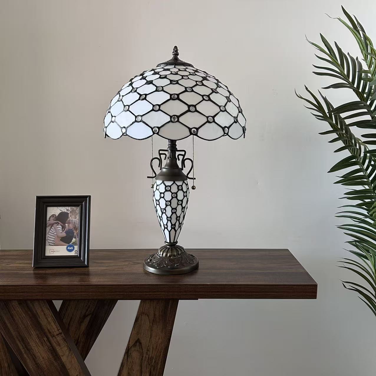 Tiffany Style Table Lamp White Stained Glass Crystal Beans Included LED Bulbs 24"H*16"W*16"D